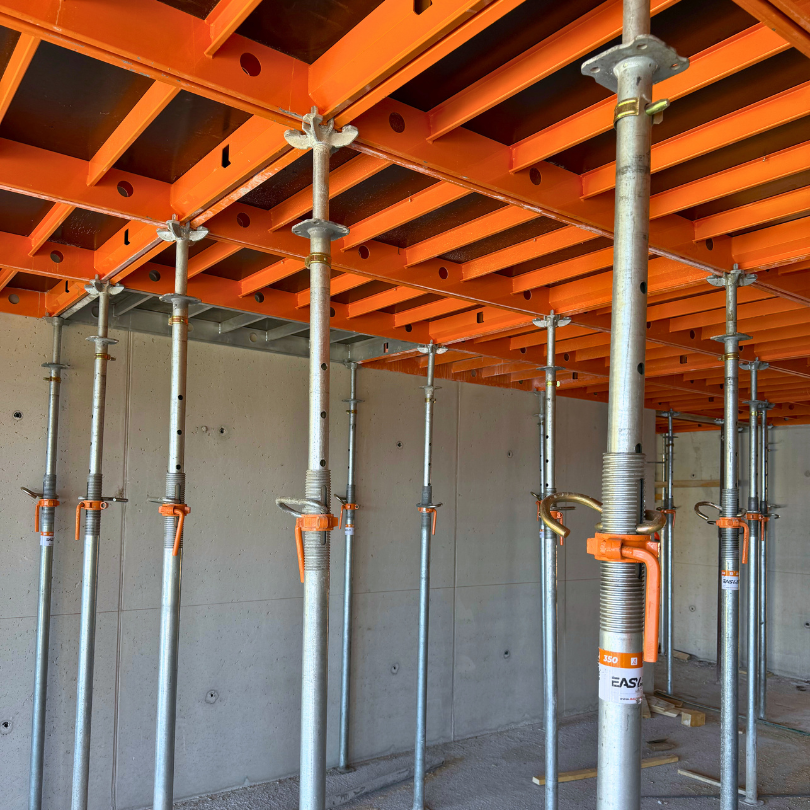 Formwork systems for walls and slabs, slab props, modular scaffolding, tower cranes, and formwork accessories – beams, tripods, heads, tie rods, plywood, spacers, and lost formwork elements.