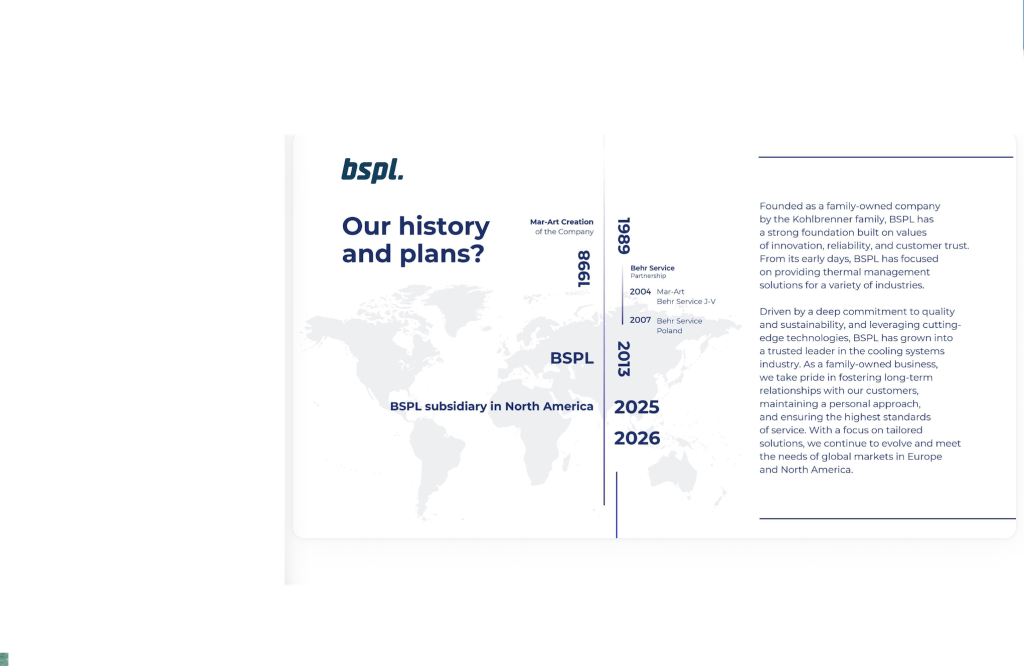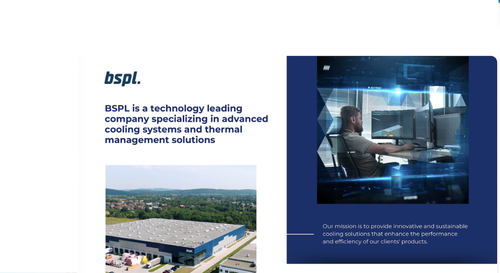 BSPL to innowacyjna firma z wieloletnim doświadczeniem w projektowaniu i produkcji systemów chłodzenia, wymienników ciepła oraz rozwiązań HVAC dla motoryzacji i przemysłu. Oferujemy kompleksowe wsparcie – od koncepcji po produkcję seryjną. Naszą unikatowość stanowi elastyczne podejście projektowe, wysoka jakość i zdolność adaptacji technologii do indywidualnych potrzeb klientów, co stwarza silny potencjał współpracy na rynku ukraińskim.
