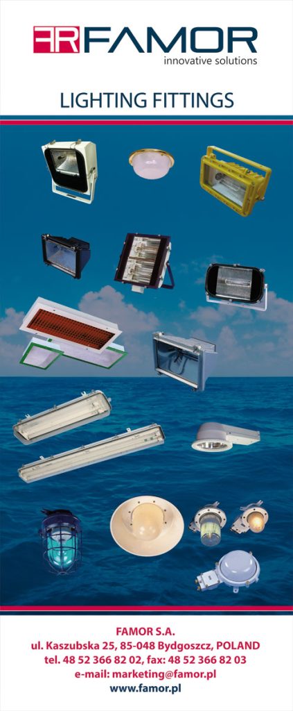 FAMOR is a provider of complete solutions in the field of lighting and electrical equipment. Our offer includes luminaires with different level of protection, using LED technology and traditional light sources, signaling equipment, low-voltage switchboards, navigation and control consoles as well as searchlights and floodlights. Our products are used in the marine industry, equipping vessels and drilling rings, as well as in many sectors of industry, including civil construction, mining and chemical industry, hospitals, the passenger rail and road transport.